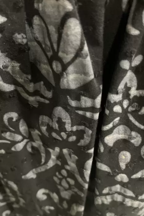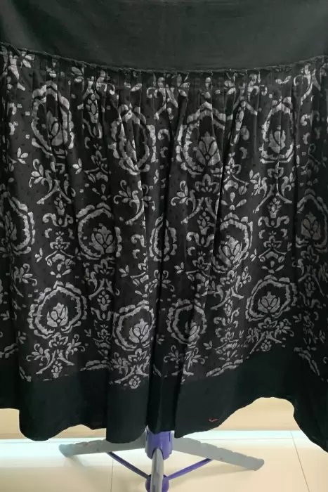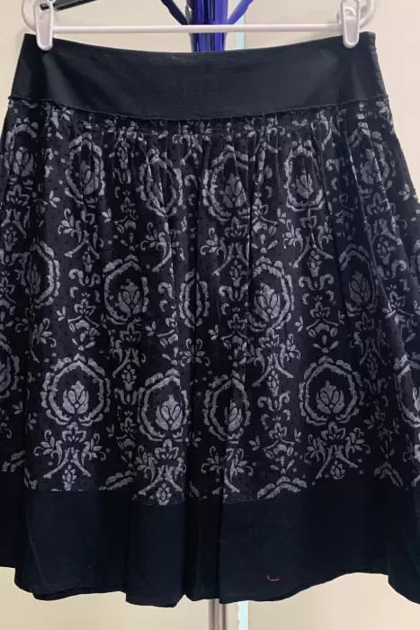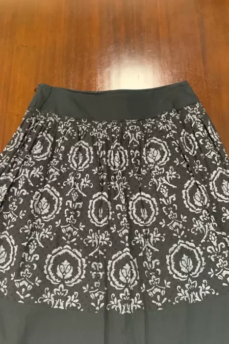 Falda de puro algodón, gris y negro, estampado discreto y con pequeños puntos bordados y parcialmente plisada. Totalmente forrado de algodón encorpado. 67cm largo y 86cm cintura.