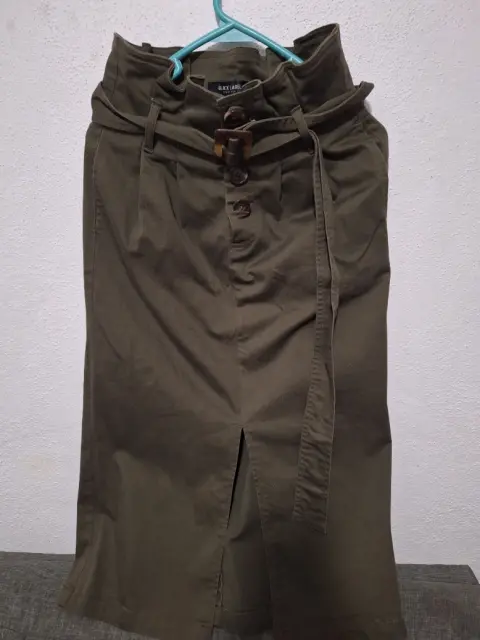 Falda marca Black Label. Falda verde militar, una puesta con avertura al frente, orma padrisimo, talla 7 a la cintura.