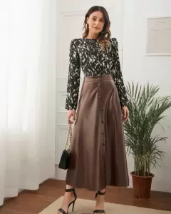 Falda midi tipo piel color café