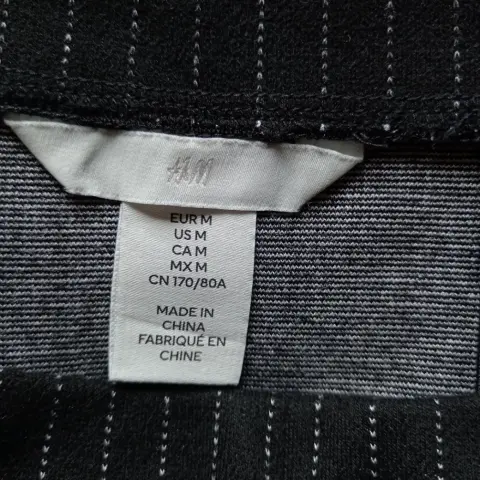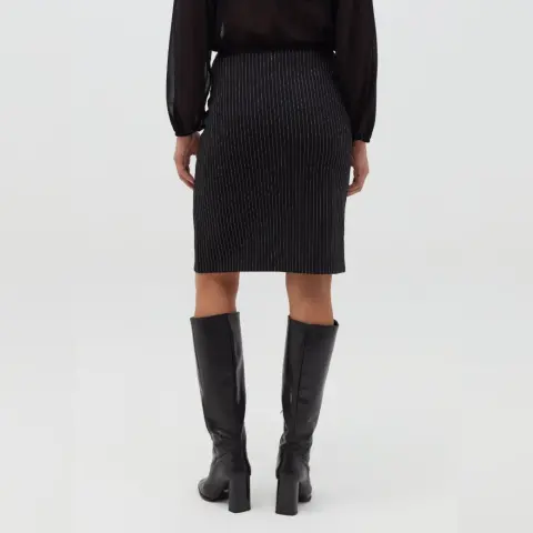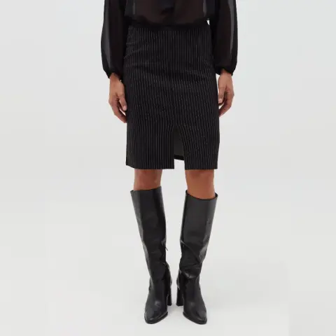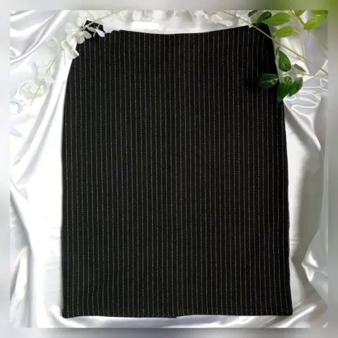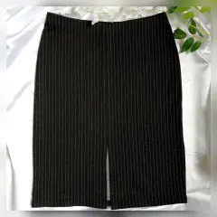 Falda negra en lápiz y abertura. Falda negra, líneas blancas verticales muy finas, H&MTalla MCaracterísticas:-A la rodilla-Modelo entallado de talle alto con cintura elástica-Bastilla recta con abertura al frenteMedidas tomadas por un solo lado:-Largo 57 CM-Cintura 37 CM