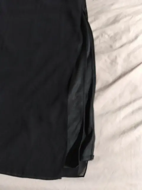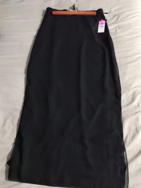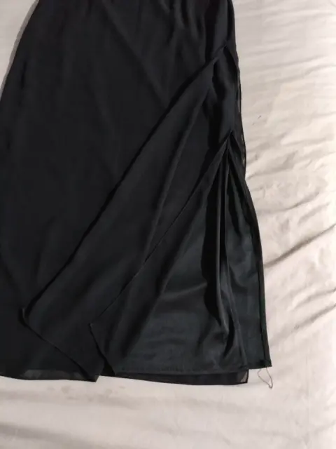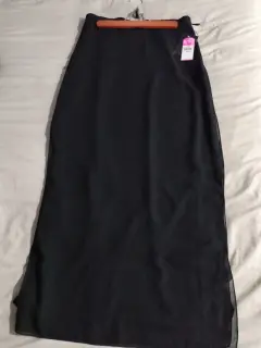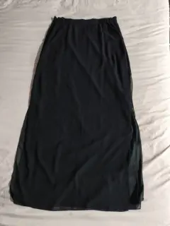 Falda Negra Larga talla 6, tela shifon con forro 100% poliéster con siper oculto y elástico laterales, lleva avetura por los lados.