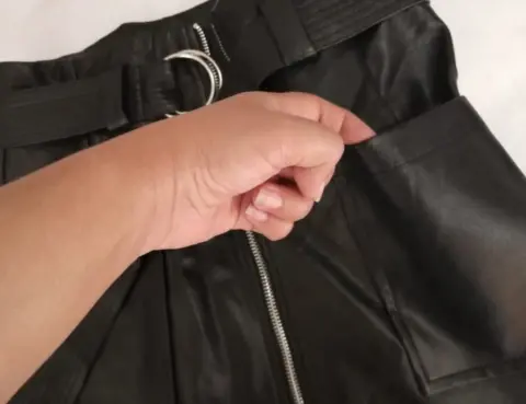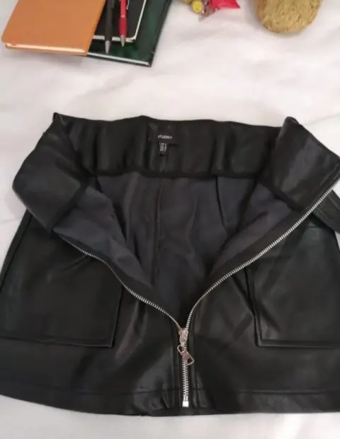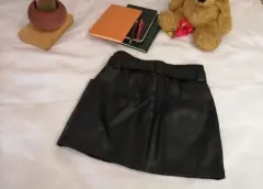 Hermosa falda de poliuretano 100%.talla 4 equivalente a una talla chica.Tiene bolsas en lps lados y tiene cinturon incluido.Solo se usó 1 vez. Cintura 36 cm y estira 3 cm masLargo 38 cm