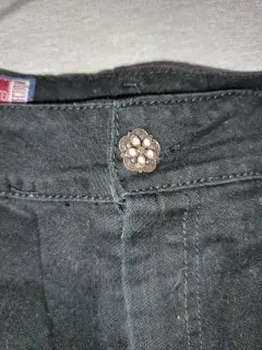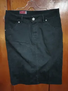 Falda negra de algodón color negro, con una pequeña abertura en la parte trasera, detalles de brillos en los bolsillos delanteros y traseros, muy amplia de la cintura, espandex
