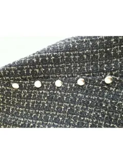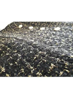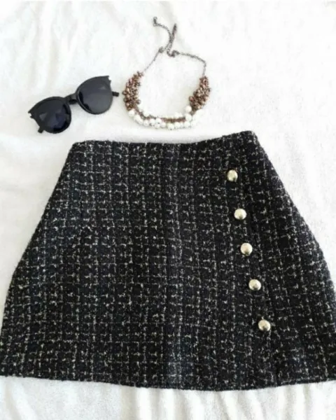 Hermosa falda estilo tweed, color negro con entretejido en dorado. Tiene botones del lado derecho (adorno)Es a la cadera, no a la cintura. Imaginate con botas largas. Medidas:41 cm cadera36 cm largo.