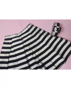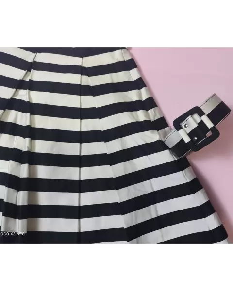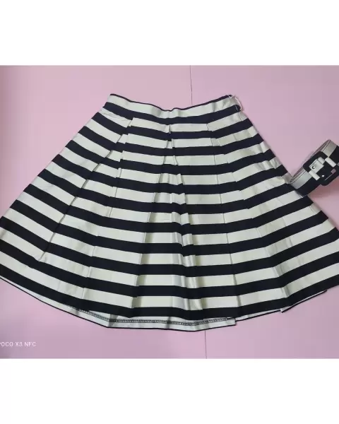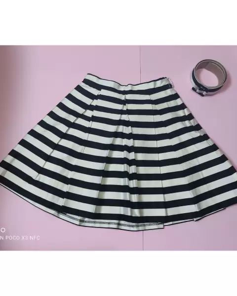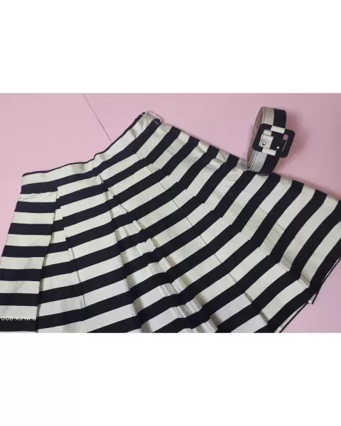 💋 Falda ONLY franjas ❣️. ❤️ Linda falda plisada con franjas negras y blancas, cierre en un costado, tiene tipo crinolina.Incluye cinturónTalla 27 extra chica, puede quedar a talla chica.Mide 31 cm de cintura y 47 cm de largoNO ESTIRA