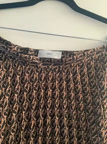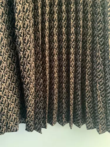 Falda plisada color café con letras negras. Largo 87 cm. En la cintura 82 cm. Con cierre. En perfecto estado. Talla L
