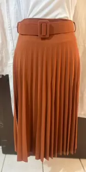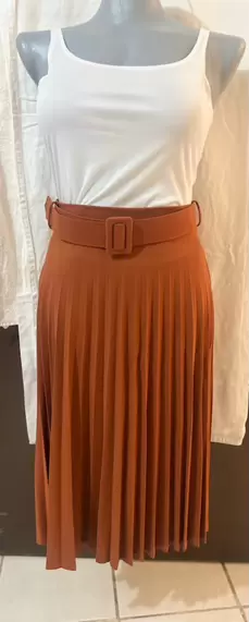 Falda plisada , tela strech con cinturón , largo debajo de la rodilla , cierre a un costado cadera , Da talla a pantalón 13 a 15 COLOR CAFÉ