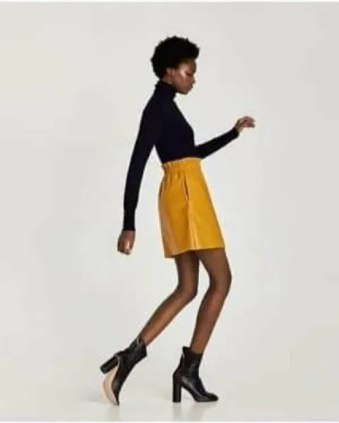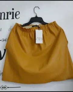 Hermosa falda Zara de polipiel con forro suave y bolsas laterales ,tiene resorte en la parte la pretina 💥 la falda es color mostaza 💥 misma falda que la primer imagen 😍 no tiene detalles es una talla M Con etiqueta✨ Está increible 😍✨💯