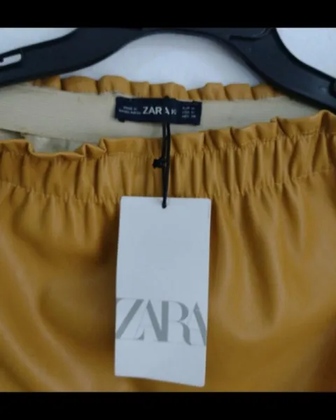 Falda polipiel ZARA 💥. Hermosa falda Zara de polipiel con forro suave y bolsas laterales ,tiene resorte en la parte la pretina 💥 la falda es color mostaza 💥 misma falda que la primer imagen 😍 no tiene detalles es una talla M Con etiqueta✨ Está increible 😍✨💯
