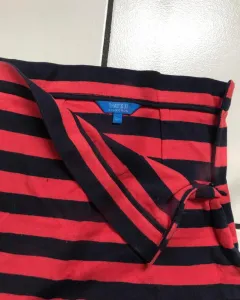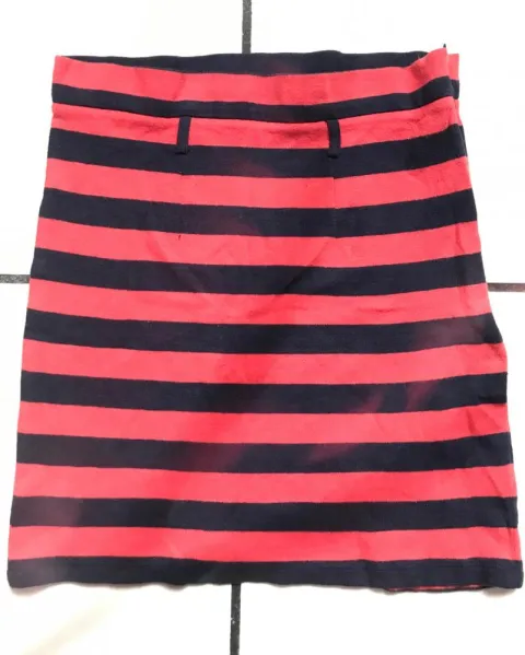 Falda rallada, azul marino y rojo, es una tela un poco calientita, trae cierre a un lado y tiene orificio para ponerle cinturón, corta.