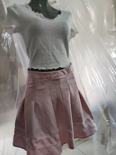 Falda rosa con rayitas blancas con pliegos. Falda blanca con pliegos rayitas blancas no tiene ningún defecto buena condiciones talla chica queda arriba de las rodillas muy bonita