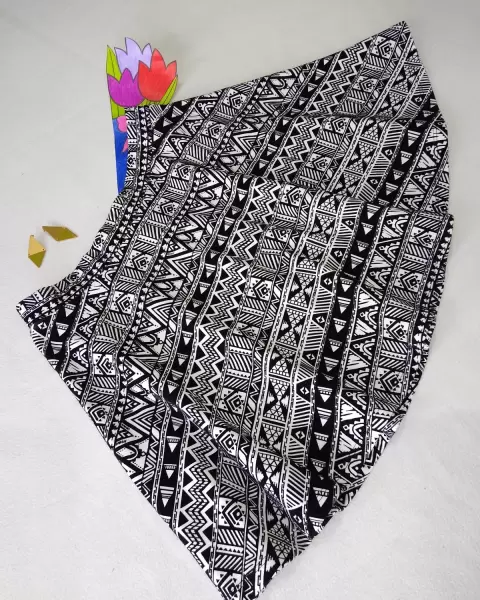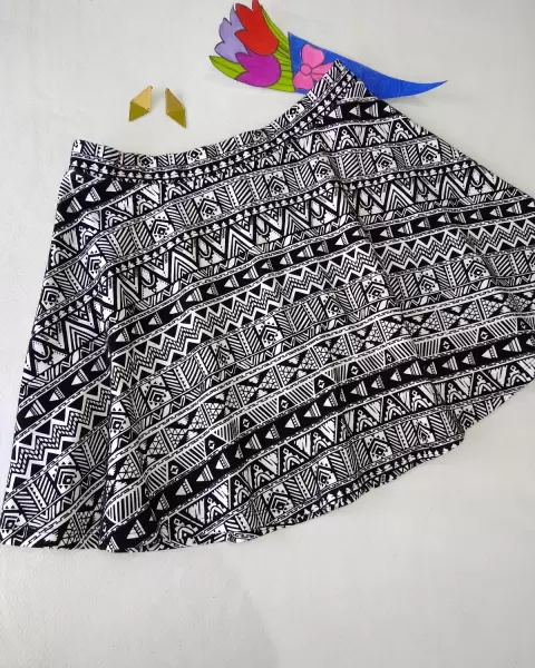Falda semicircular aeropostal. Hola chic's!!En venta hermosa falda semicircular ,en color negro -blanco con grecas, un par de puestas. Lo negro es aterciopelado..muy lindoMedidas: Cintura 40 Largo 41Se envia limpia y desinfectada🤩Te invito a visitar mi clóset!, Y armar tu paquete con descuento 🤗💞