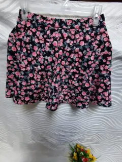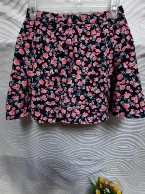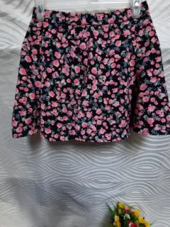 Falda semicircular de poliéster stretch, estampado floreado pequeño, fondo negro y flores rosas, pretina con ojal y botón. Cierre en espalda, pinzas dobles.Talla: S (26-28) Marca: DIVIDED H&M.