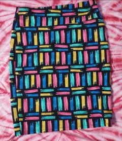 Falda strech multicolor. Esta linda falda la puedes combinar prácticamente con todos los colores colores. La tela es stretch y estira bastante. Es sumamente cómoda. No cuenta con cierre. Le queda perfectamente a tallas mediana y grande.