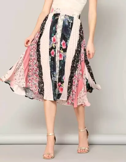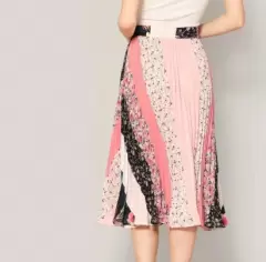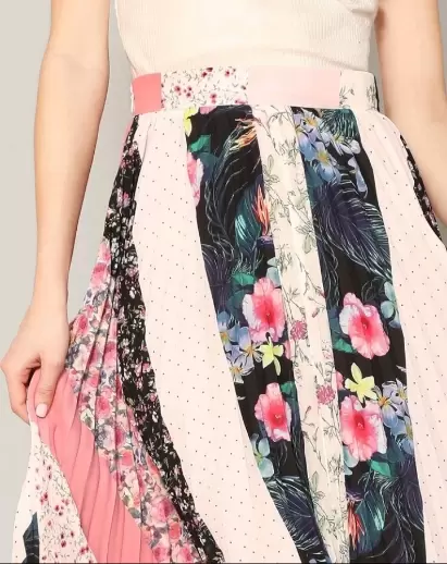 Falda Midi plisada o tableada, colores y estampado mixto. Cintura ancha. Largo 76 cm contorno cintura 74 cm Contorno Cadera 164 cm.Composición 100%Poliéster