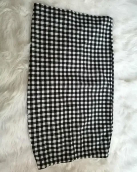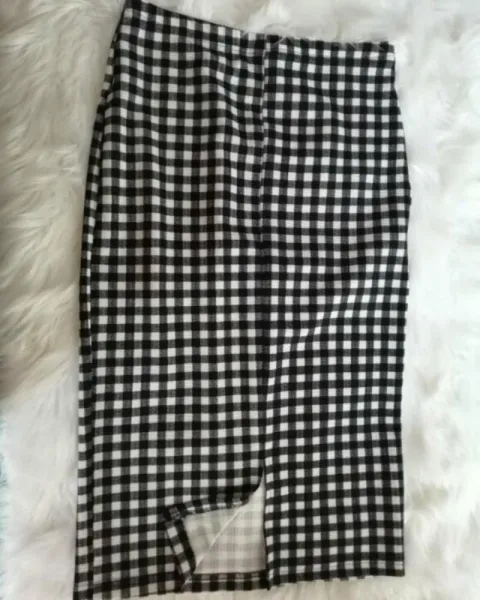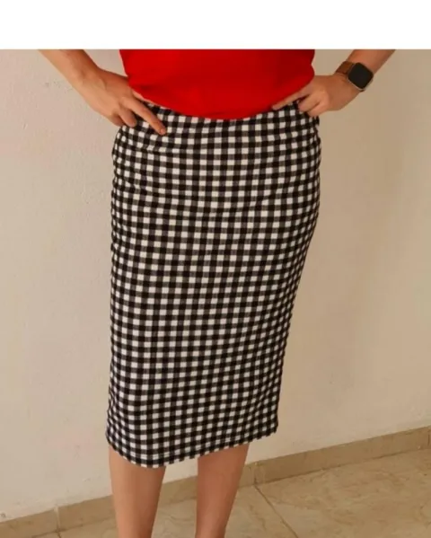 Falda tipo lápiz ajustada. De cuadros color blanco con negro. La tela se estira