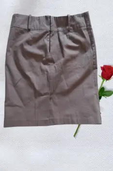 Falda casual tipo lapiz con detalle de argollas ala cintura, en la parte inferior izquierda ya se le cayeron algunas. Medidas: cintura 39 cm, largo 51 cm.