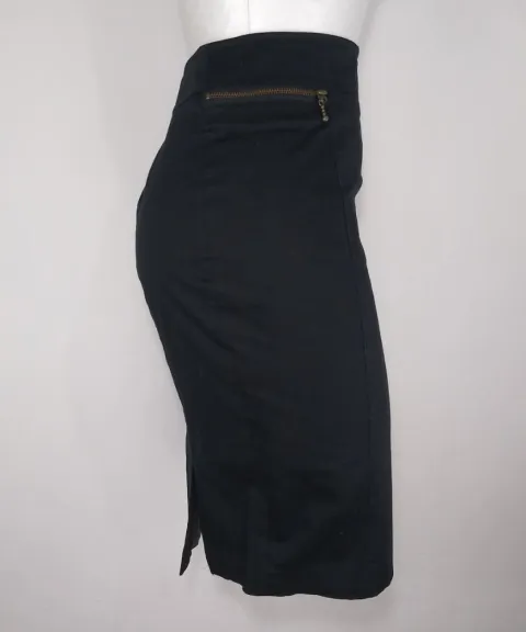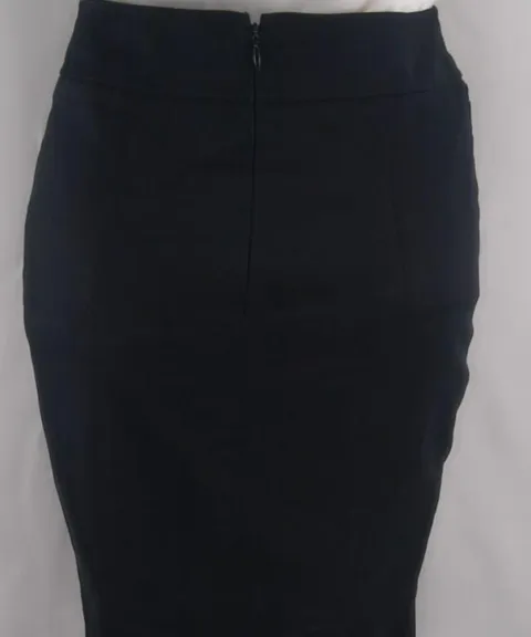 60 Falda tubo bolsa simulada en costado. Doble abertura trasera. Cierre con cremallera y broche de gancho. Color Negro. Composición: 98% Algodón, 2% Spandex. Forro 100% Poliéster. Medidas: Cintura 36 - Cadera 47 - Largo 58 cm. Sin detalles, puesta solo una vez.