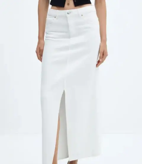 Falda vaquera abertura. Falda larga estilo tejano vaquero, diseño recto, abertura posterior, cinco bolsillos, tejido de algodon.