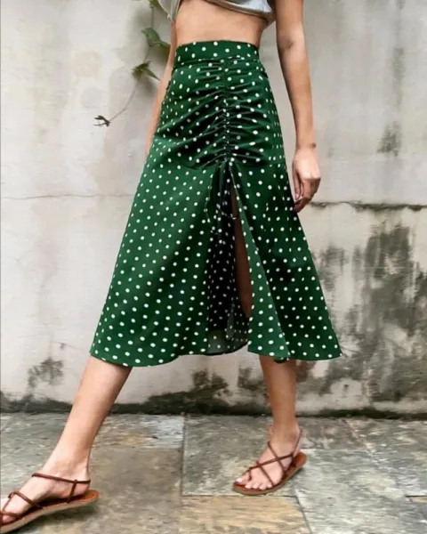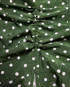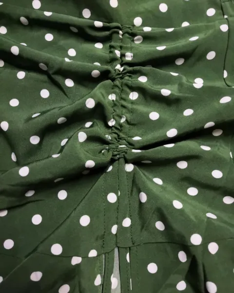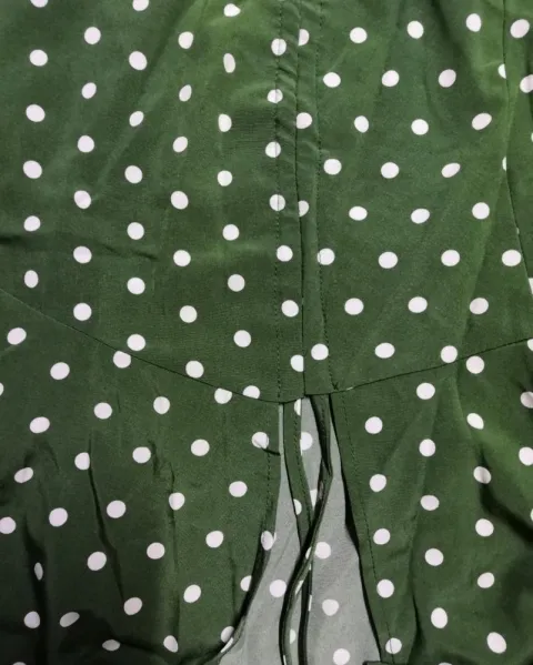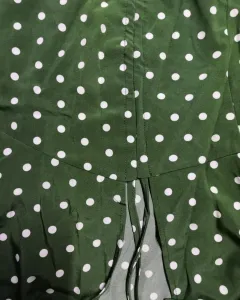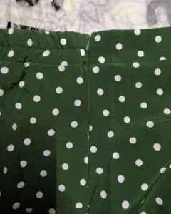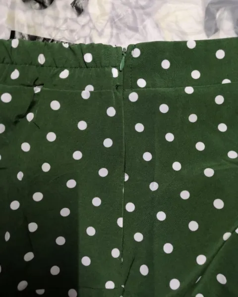 Falda drapeada verde con lunares blancos, tiene cordones para hacerla corta con abertura en la pierna. Tela delgada y fresca.
