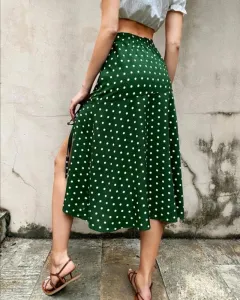 Falda verde con lunares blancos. Falda drapeada verde con lunares blancos, tiene cordones para hacerla corta con abertura en la pierna. Tela delgada y fresca.