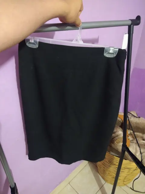 Falda negra con abertura en la oarte traseraTalla medianaTiene dos puestasSin detallesCintura 40 cm