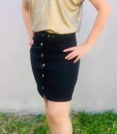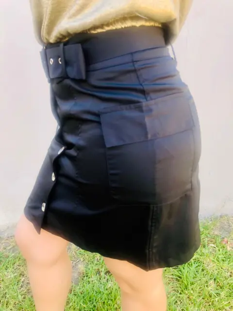 Falda tipo cargo con bolsas utilizables, abotonada con cinto ancho, tela fresca semi-stretch. Color negra talla S.