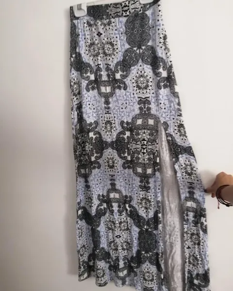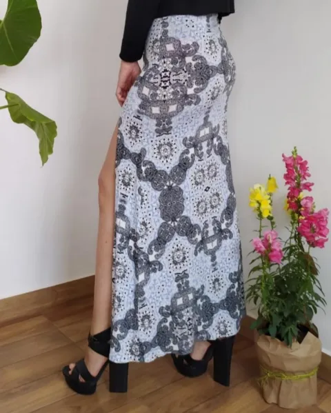 Falta larga con abertura de costado. Linda falda estampada, ideal para el verano, la tela strech, muy cómoda, tiene una pequeña mancha en el frente pero de lejos es imperceptible, no afecta a su uso. La cinturilla es de resorte.