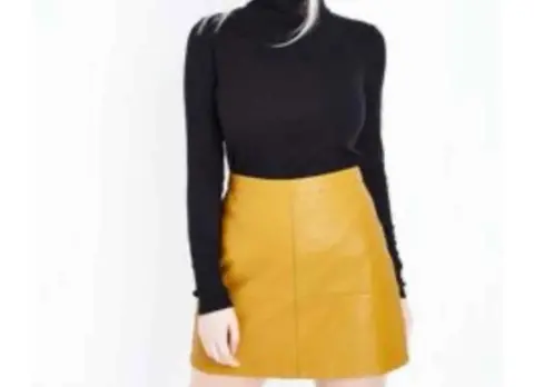 Falda tipo piel, color mostaza talla L 40cm. Cintura y 43 cm. Largo. Solo se usó una ocasión , está en buen estado. (La foto de modelo es como muestra de más o menos como se vería)