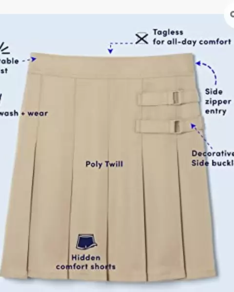 French Toast Scooter- Falda plisada de dos capas. French Toast falda escolar de niña, talla 14-R, color azul marino con un detalle de doble hebilla y pantalones cortos suaves incorporados, cae por encima de la rodilla, heha de 100 % poliéster 50 Resistente al lavado y a la decoloración. cintura ajustable para un ajuste perfecto. detalle de lengüeta decorativa con hebilla plateada brillante. parte delantera plisada, y pantaloncillo corto de punto para mayor comodidad, nuevos a estrenar.