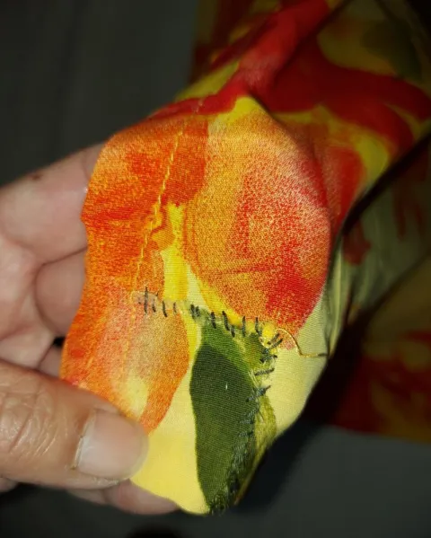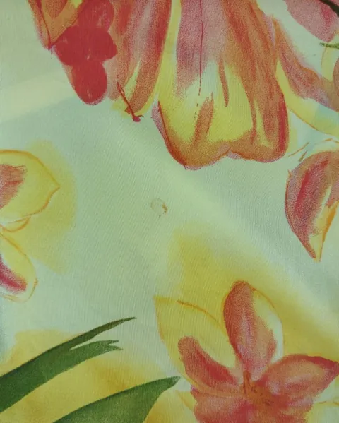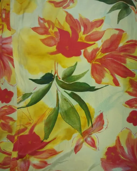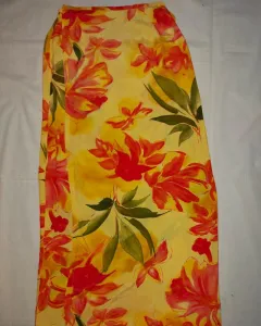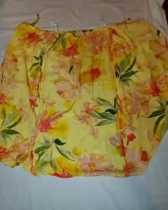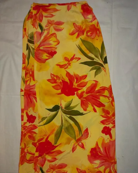 Hermosa falda floreada envolvente, la puedes usar como pareo, tiene unos colores hermosos, pero tiene dos detalles uno se ve en la foto 2 y otro en la 3, la de la foto 3 se tapa xq es cruzada o envolvente, la dos si queda enfrente pero es muy pequeño el detalle. No tiene forro.