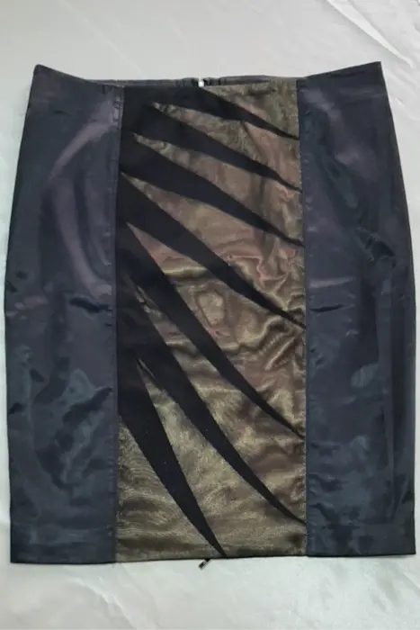 Hermosa falda lápiz BEBE arriba de la rodilla. Hermosa falda lápiz de vestir bebe, arriba de la rodilla con decoración en dorado y tul negro al frente, con forro y ciper en la parte trasera
