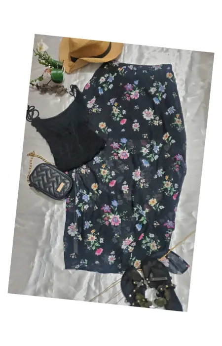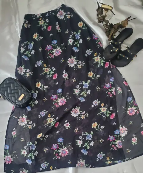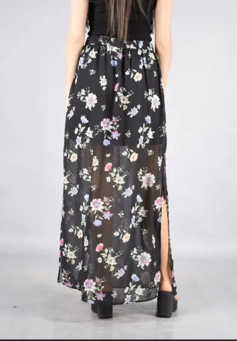 Maxi falda semi transparente negra con flores. Falda de temporada tela suave. Trae forro en la parte de arriba abertura de lado