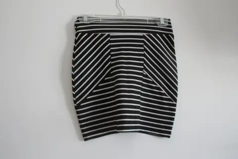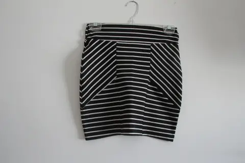 Falda de camiseta, rayas blanco y negro. Una puesta, tiene presillas para cinturón, mide 34cm de cintura sin estirar y modo plano, de largo 40cmMarca Tierra bendita, talla S.