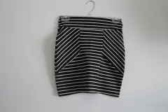 Minialda rayas tipo camiseta. Falda de camiseta, rayas blanco y negro. Una puesta, tiene presillas para cinturón, mide 34cm de cintura sin estirar y modo plano, de largo 40cmMarca Tierra bendita, talla S.