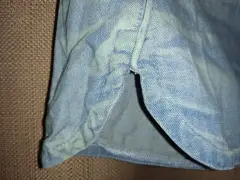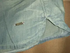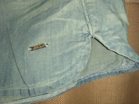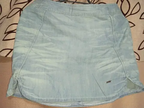 Color mezclilla, detalle en los muslos de abertura, cierre funcionando al 100.
