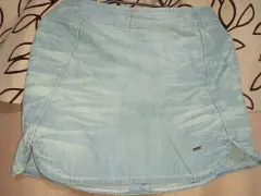 Minifalda. Color mezclilla, detalle en los muslos de abertura, cierre funcionando al 100.
