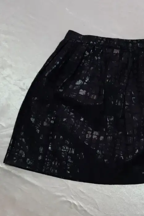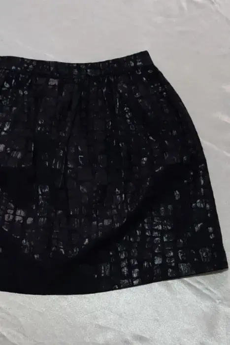 Minifalda con estampado tipo cocodrilo. Hermosa minifalda negra a la cintura con estampado brillante tipo cocodrilo