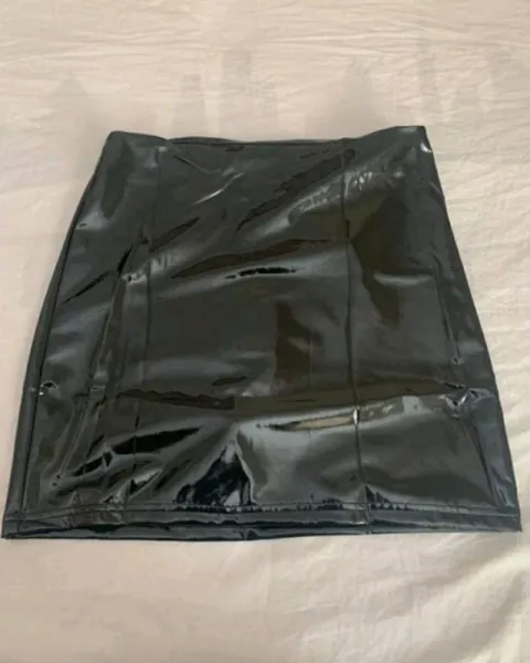 Minifalda de charol negra con cierre invisible trasero. La etiqueta indica talla L pero viene reducida.NUEVA SIN DETALLES.