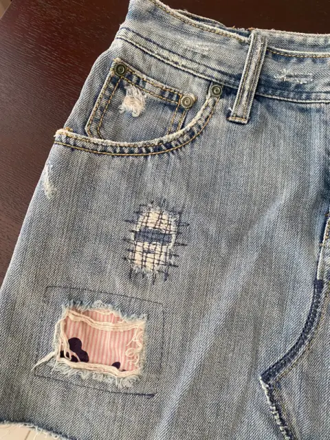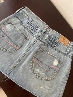 Minifalda de Mezclilla American Eagle.Tiene zipperBolsillos atrás.Modelo con detalles descosidos y rotura con paliacate rosa que se ve muy lindoTalla 0Queda a XS y XXS