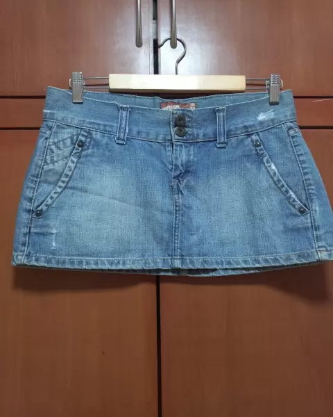 Minifalda de mezclilla deslavada, talla 28, corte a la cadera, medida de lado a lado 42 cm, puesta una vez.