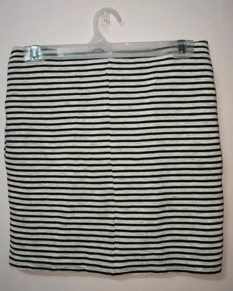 Minifalda a rayas, apertura frontal. Se ciñe al cuerpo. Es L pero queda mejor en M.