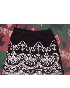 Elegante y bien construida minifalda con bordado blanco y tela tacto gamuza negra. Completamente forrada, muy linda para el invierno con mallas