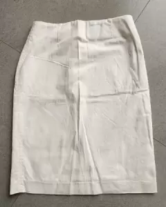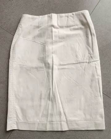 Talla 32. Tela algodón alta densidad. Forro poliester. Tipo lapiz con abertura posterior. Largo a la rodilla. Cierre nylon. Bordado decorativo del mismo color de la tela a ambos costados.