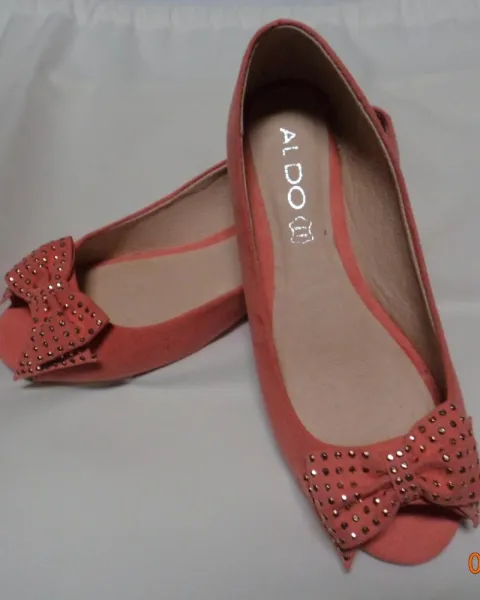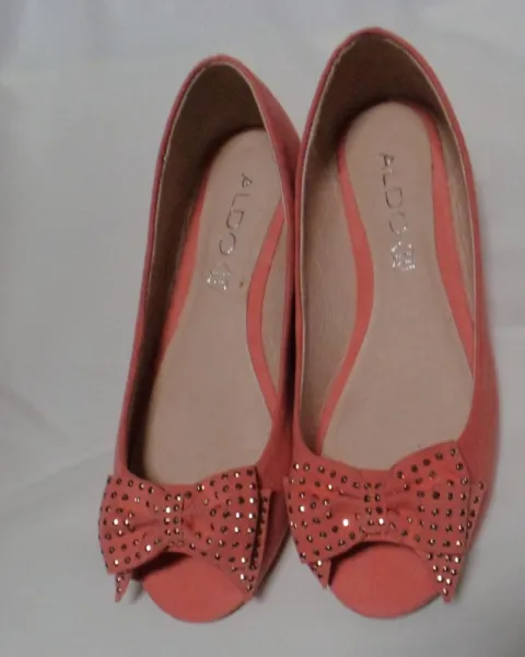 Flats coral Aldo. Flats Aldo del número 36 europeo que equivale a un 3 mexicano, abiertas al frente, con moño que trae aplicaciones plateadas.