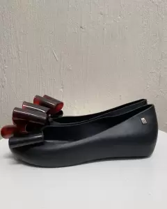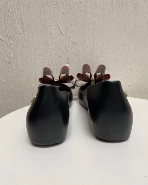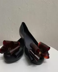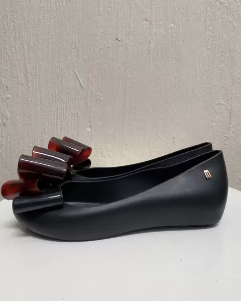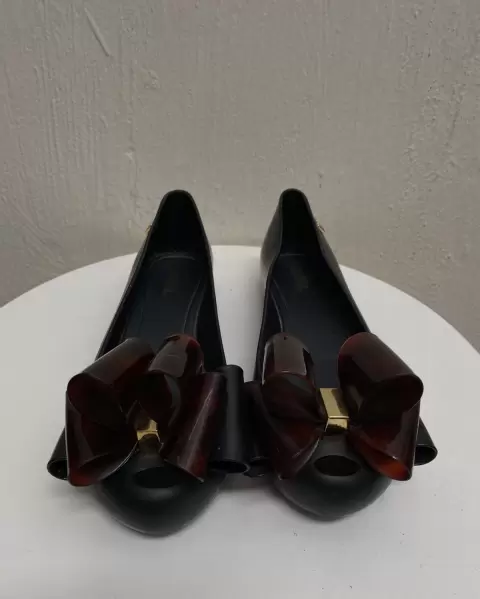 Flats MELISSA con moño al frente. Negros con cafè, sin detalles solo faltara mayor limpieza , marcado 4, puede quedar 4.5 por ello lo indiqué