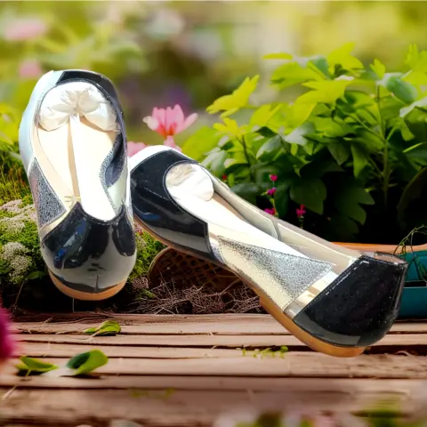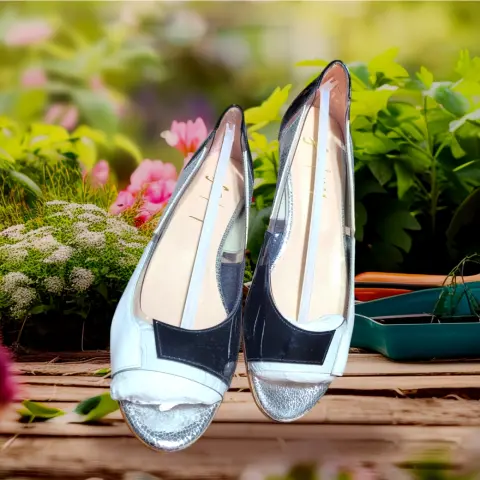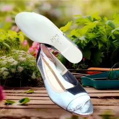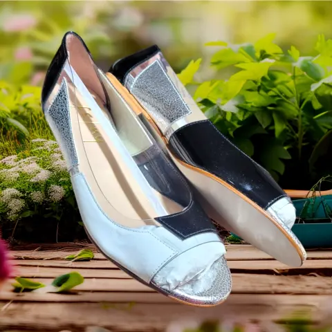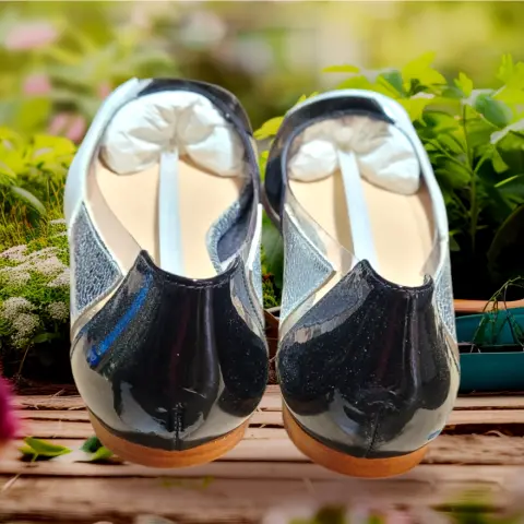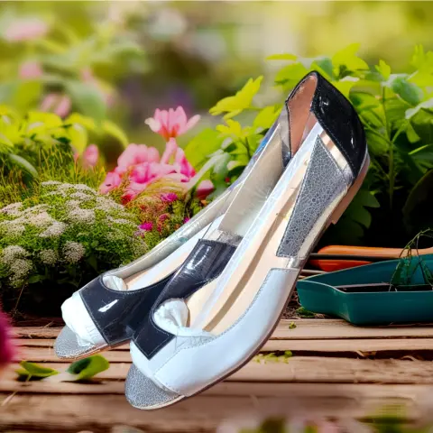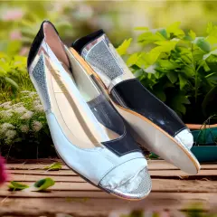 Zapatilla Clasica Punta abierta FSNY, modelo Nisim, talla 25, colores blanco, negro y dorado, punta abierta, plantilla acolchada, suela flexible plana con tacon de 1cm de alto, hechos de suela de piel vaqueta y acento de plastico piel y charol en cuerpo, nuevas a estrenar en caja original en buen estado cosmetico.