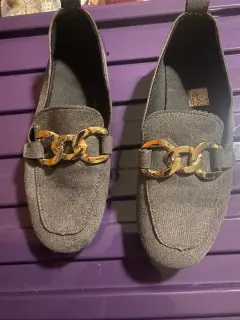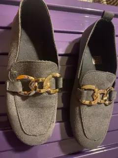 Zapatos cómodos de piso de gamuza gris con colores dorados. Solo los use unas 3 horas