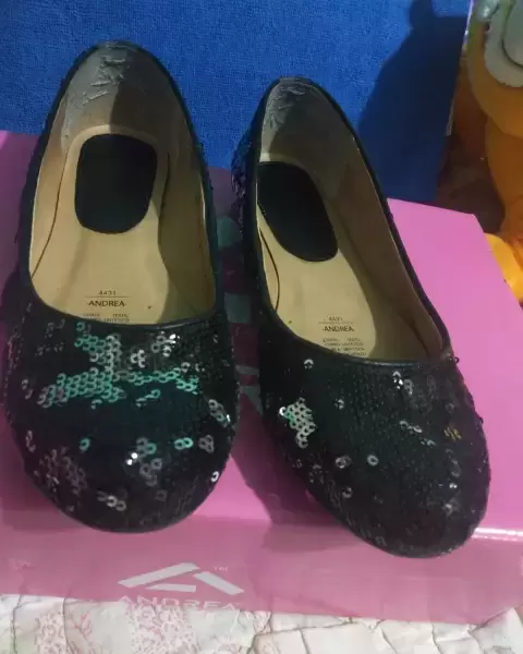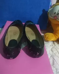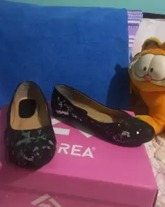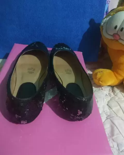 Hermosos Zapatos de piso, estilo flat, muy cómodos, estilo redondea, corte textil -lentejuelas negras y plateadas, que le dan un toque de brillo, forro y suela sintética. Detalle de piel en el talón. Talla 22, sin embargo, queda perfecto al 22.5.