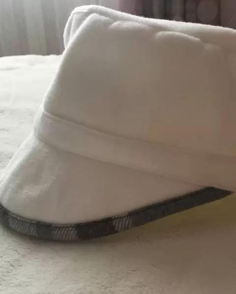 Boina beige con flor a detalles cuadrados gris. Ideal para el invierno, suave y afelpada. Muy cute.